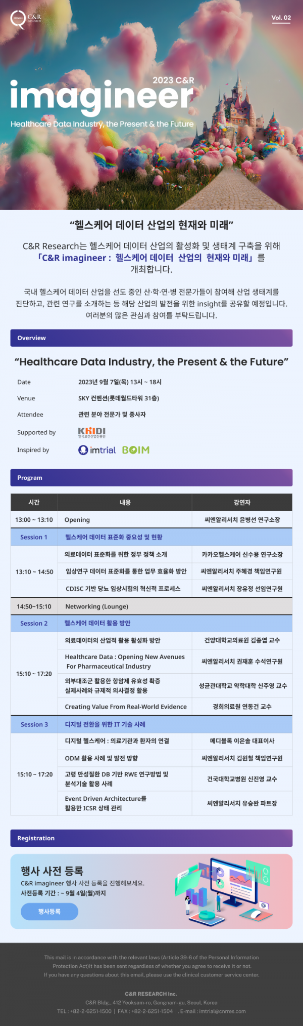한국임상CRO협회 회원사인 씨엔알리서치에서 헬스케어 데이터 산업의 생태계를 구축하고 활성화하기 위해 「C&R imagineer : 헬스케어 데이터 산업의 현재와 미래」를 개최합니다. 국내 헬스케어 데이터 산업을 선도 중인 산·학·연·병 전문가들이 참여해 산업 생태계를 진단하고, 최신 연구를 소개하는 등 해당 산업의 발전을 위한 insight를 공유할 예정입니다. 회원사 여러분의 많은 관심과 참여를 부탁드립니다.