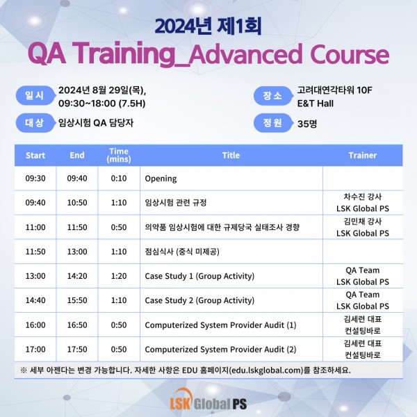 LSK Global PS에서 실시하는 QA Training Advanced Course를 안내하여 드리오니, 회원사 여러분의 많은 관심과 참여를 부탁 드립니다.
